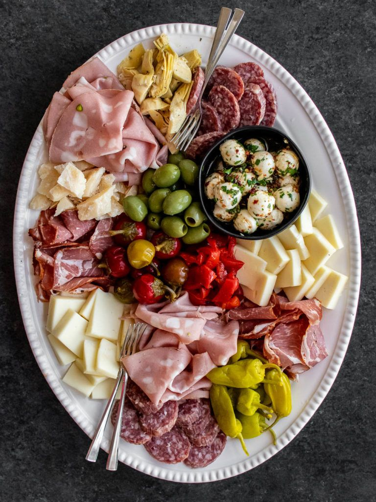 An Italian antipasto platter is a combination of cured meats, cheeses, vegetables, and olives.
