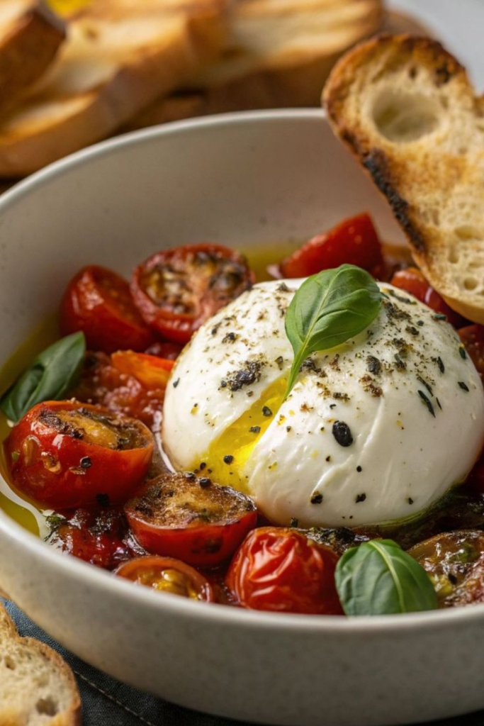Burrata is a fresh Italian cheese with a creamy center. Served as an appetizer, it is often paired with: