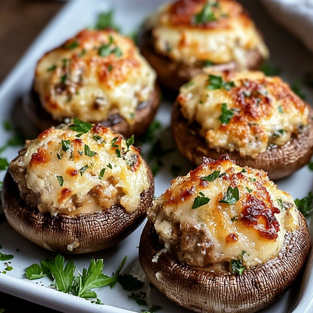 Italian stuffed mushrooms are baked and filled with flavorful ingredients.